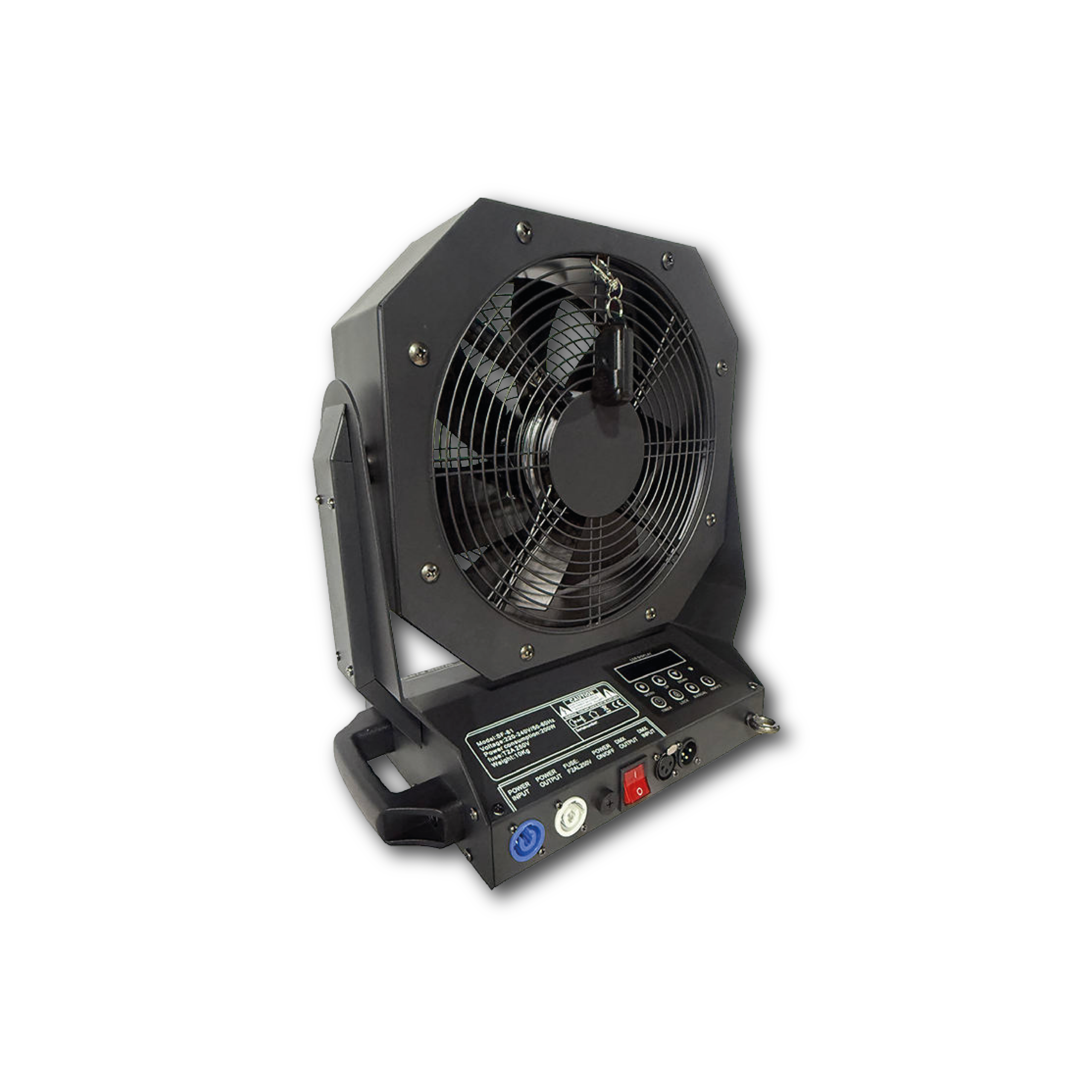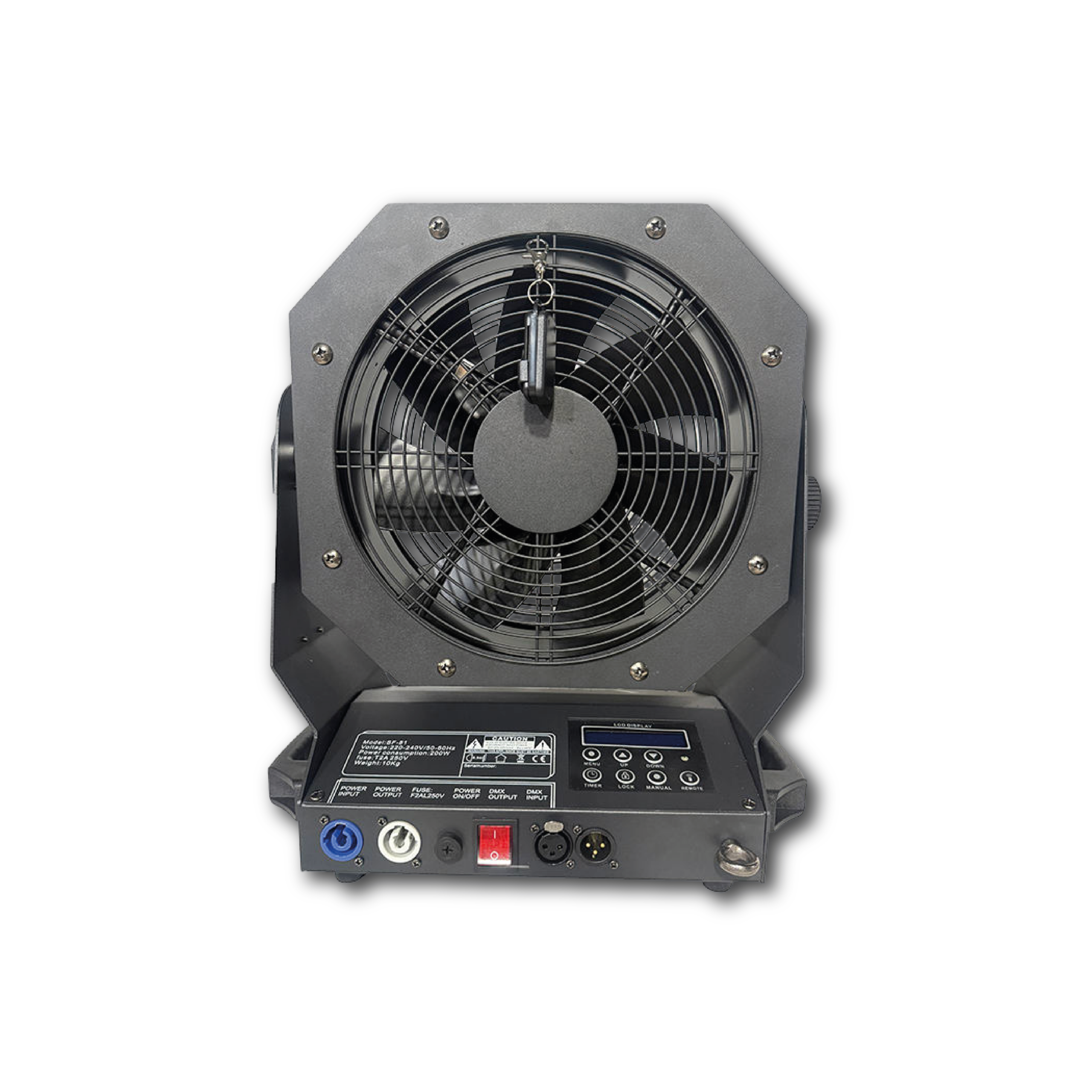 Generatore di vento professionale Fan-200 da 200W con controllo DMX, inclinazione regolabile e flusso d’aria 40 m³/min. Perfetto per effetti scenici con fumo e nebbia.